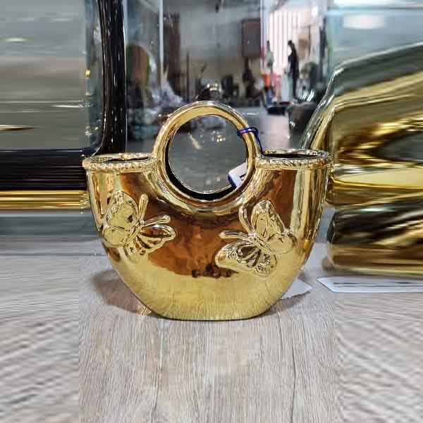 This is a luxurious decorative vase designed in a unique purse-style shape with a glossy golden finish.
